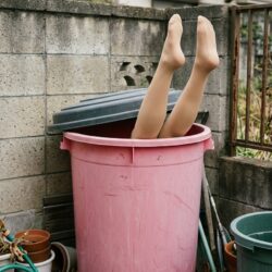 Social Lens 大きなポリバケツの中からベージュパンストに包まれた脚だけが飛び出しているシュールな画像
