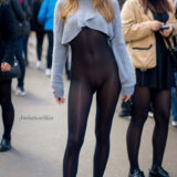胸までパンスト?! ノーパン黒パンストに超短いセーターを着て街を歩いている女性の画像